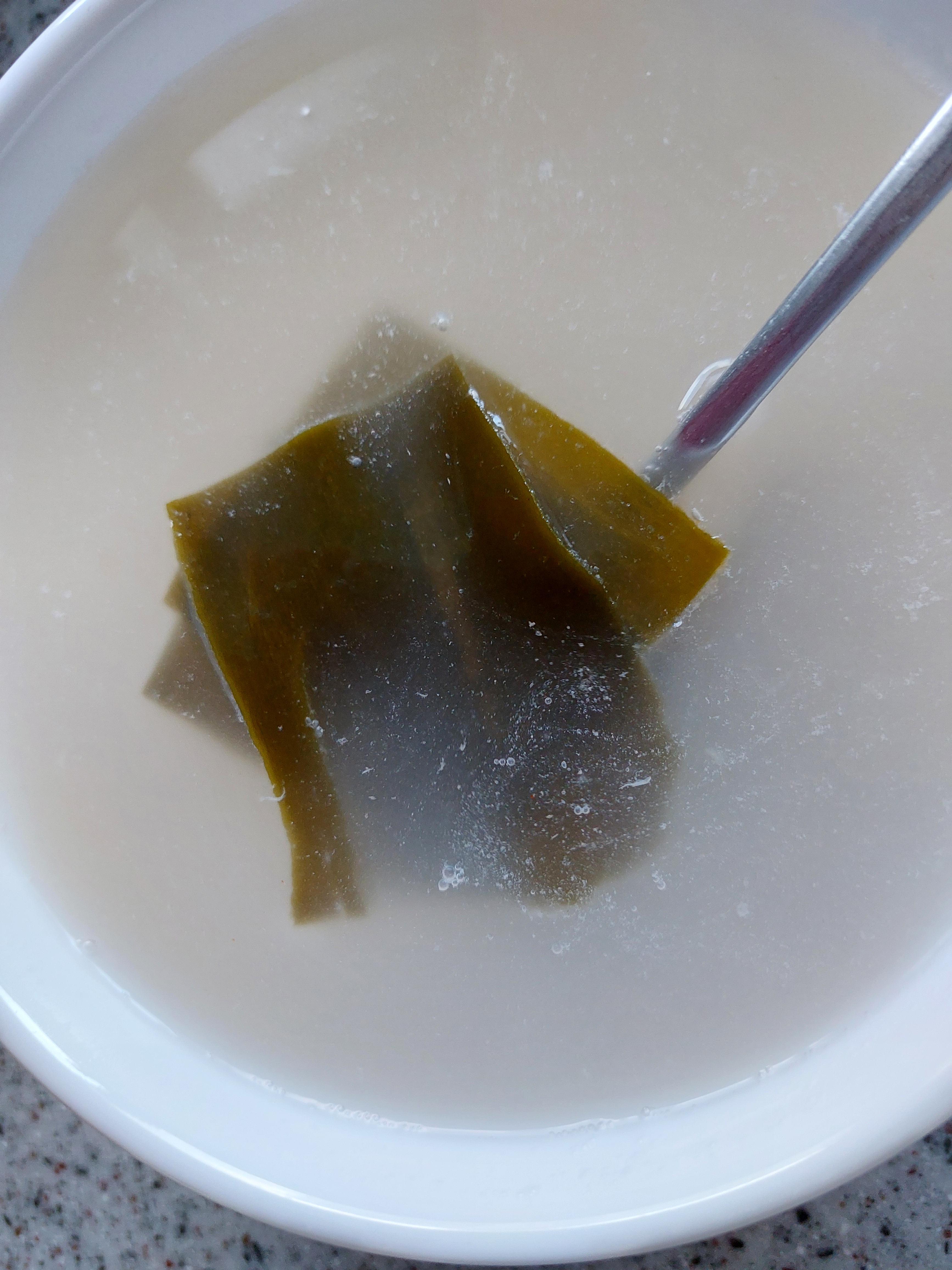 쌀뜨물에 다시마 3~4장을 넣고 약 10분 정도 담가서 다시마를 우려낸다.