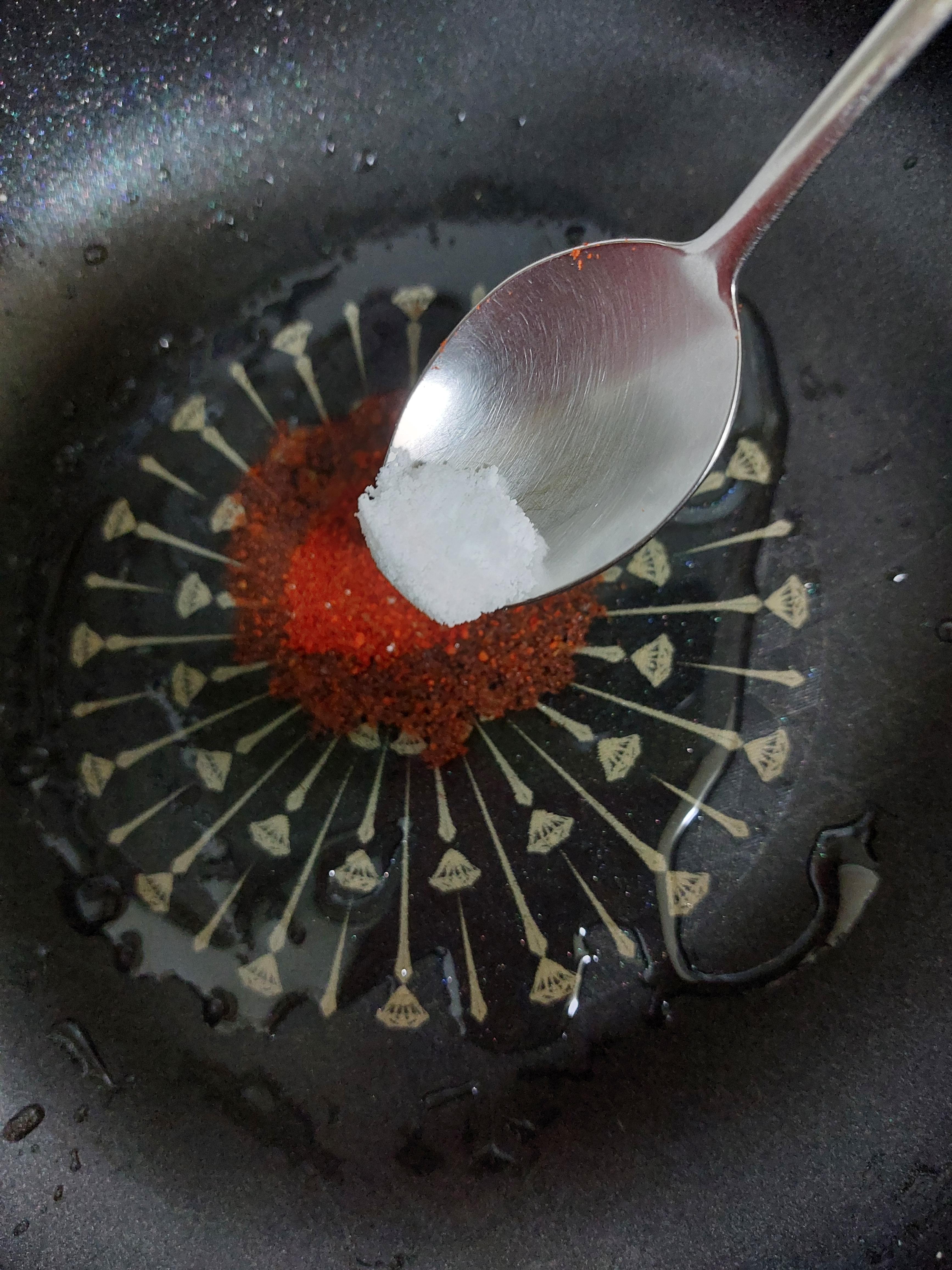 냄비에 식용유를 넣고 고추가루를 넣어준다.